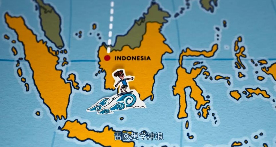 9岁的雷欧想学冲浪,他们就去到印尼,让雷欧体验冲浪的刺激。