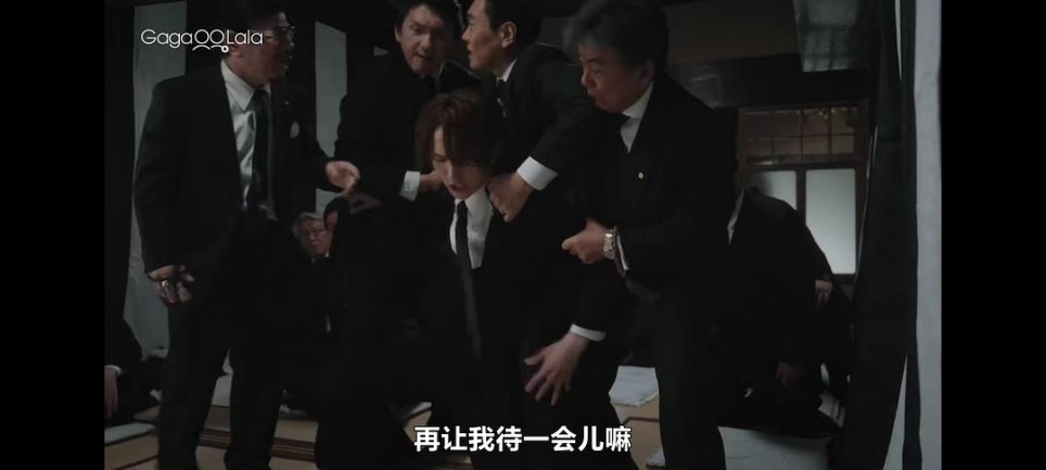 但是剧版呈现的方式很奇怪,它看起来像是四代目给混在人群后面的杀手递了个眼色示意开始行动,然后自己就缩到后面去了(不是大哥,这么多人看着呢?你这么整真的好吗?),杀手就开始杀攻(而此时攻就坐在四代目的亲妈大姐头身边,就以他这个枪法,四代目你不怕他打中你亲妈吗?),打了第一枪偏了,打到了榻榻米上,小弟们开始一拥而上抢枪,开始了那个漫长又离谱的动线(这个前面已经吐槽过了就不重复了)……整个混乱的枪战看起来就像是为了染血初吻那碟醋包的饺子,导演想要利用自然光打到攻受的脸上塑造出一种神圣感,这样吻起来会很好看,