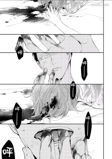 可以看出来,一开始的受对于自己莫名其妙被给予的新身份是抗拒的,表现得十分无所适从。【母亲】负有保护孩子的义务,而【孩子】是父母的【道具】,但是【妻子】与向下负责的【母亲】和向上负责的【孩子】都不同,这层身份只与相爱的盟约有关,它只要求爱自己的【丈夫】,受开始害怕地退却了。医院里受的纠结到达了顶峰,父权(四代目)要求的【顺从】和夫权(攻)要求的【爱情】在受的身上纠结成了一团乱麻,所以漫画作者故意将这一场杀戮处理得非常色情:受缓缓地向下伸手,下一格就是攻熟睡的侧脸,当你误以为受是要去抚摸爱人的脸颊时,他的手却又突然下坠,扣在了攻的脖颈上,然后变成全景,这时读者才发现受几乎是以脐橙的姿势跨坐在攻的腰上的(同时这也是【初夜】那晚他俩一开始的姿势),然后四代目的声音在耳边响起,面目却是模糊不清的,相比之下,攻的笑容却无比清晰地浮现在脑中,受俯身下去一度想要用力,却又最终松了手